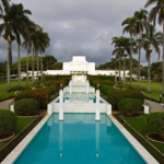 The 42,100-square-foot temple sits a half-mile from the Pacific Ocean on grounds and gardens covering 7.6 acres, part of the original 6,000-acre Laie Plantation purchased in 1865 for $14,000. It is one of three temples — the Cardston and Mesa Arizona temples being the other two — that do not feature towers or spires in their design.