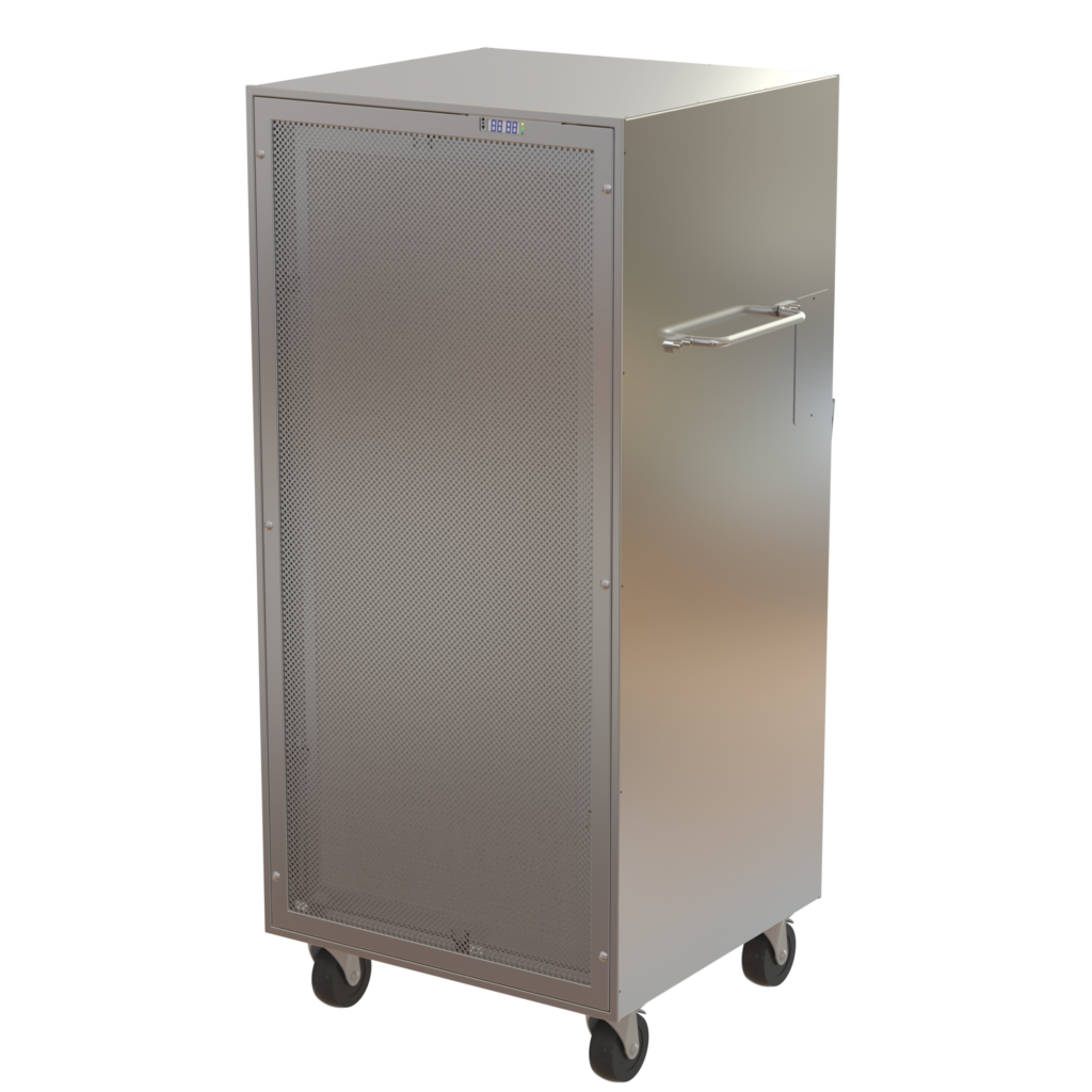 The portable reverse-flow unit draws air in through the face, then exhausts HEPA-filtered air out through ductwork that can be connected to room exhaust or vented out through a window. It’s a fast and easy way to turn existing spaces into isolation areas.